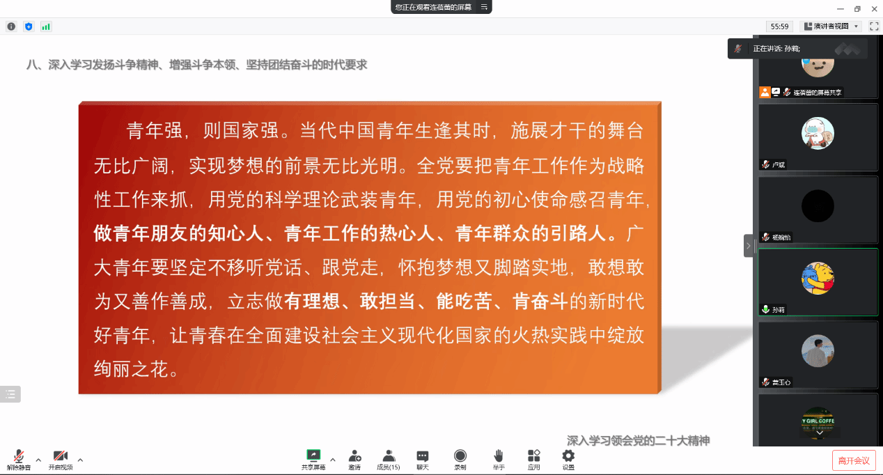 活动最后,支部书记孙莉同志进行了总结,党的二十大报告,体现了百年大党引领时代的担当、人民至上的情怀和胸怀天下的格局,是全面建设社会主义现代化国家、全面推进中华民族伟大复兴的宣言书,具有划时代的里程碑意义,并希望师生支部全体党员同志深入理解内涵,精准把握外延,将二十大精神落实到教学和学习实践中去。