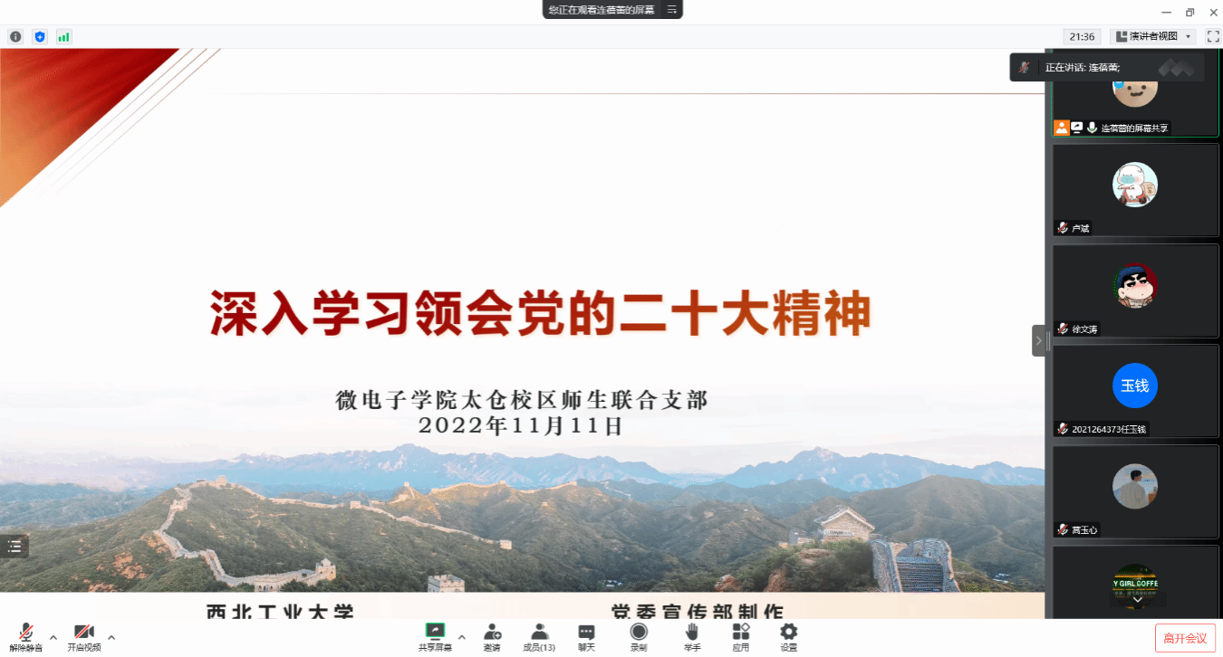 的学生,我们要坚定不移听党话、跟党走,时刻将人民健康牢记心间,在科学研究中刻苦钻研、勇毅前行,为解决微电子问题贡献中国智慧、中国方案、中国力量,让青春在全面建设社会主义现代化国家的火热实践中绽放绚丽之花。杨婉怡同志表示,只要坚持着国家的领导方针,坚持着党的领导,脚踏实地奋勇前进,我们就能踏上新征程,实现更好的未来。作为学生党员,我们要多领略党的知识,积极了解时政新闻,从而努力向更好的方向前进。蒿玉心同志表示,新时代青年生活在一个充满挑战的时代,新冠肺炎疫情肆虐全球,世界局势复杂多变。但我们更生活在一个充满希望的时代,党用伟大奋斗创造了百年伟业。新一代中国青年应该坚定理想信念,树立远大志向,增强民族自信,坚定不移跟党走。