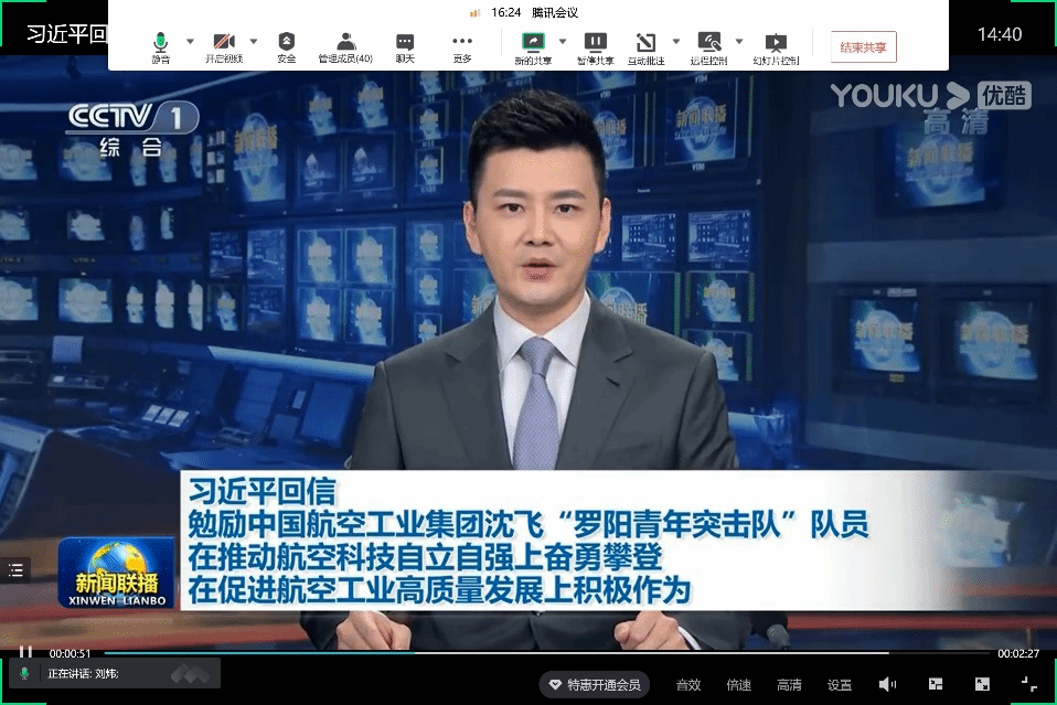 会议开始,刘炜介绍航空英模罗阳与罗阳青年突击队的事迹:2012年11月25日,在我国歼15舰载机首次成功完成着舰起降试验仅十几个小时后,歼15舰载机研制现场总指挥罗阳突发急性心肌梗死、心源性猝死,经抢救无效,因公殉职,终年51岁。转眼十年过去,一群沈飞年轻人在罗阳战斗过的地方,组建了“罗阳青年突击队”,撑起了航空报国的新天空。这个突击队是沈飞青年员工自发组成,他们秉承罗阳烈士遗志,立志攻坚克难,哪里有急难险重的任务,哪里就会竖起“罗阳青年突击队”的队旗。多年来,罗阳青年突击队解决各类技术质量问题1000余项。