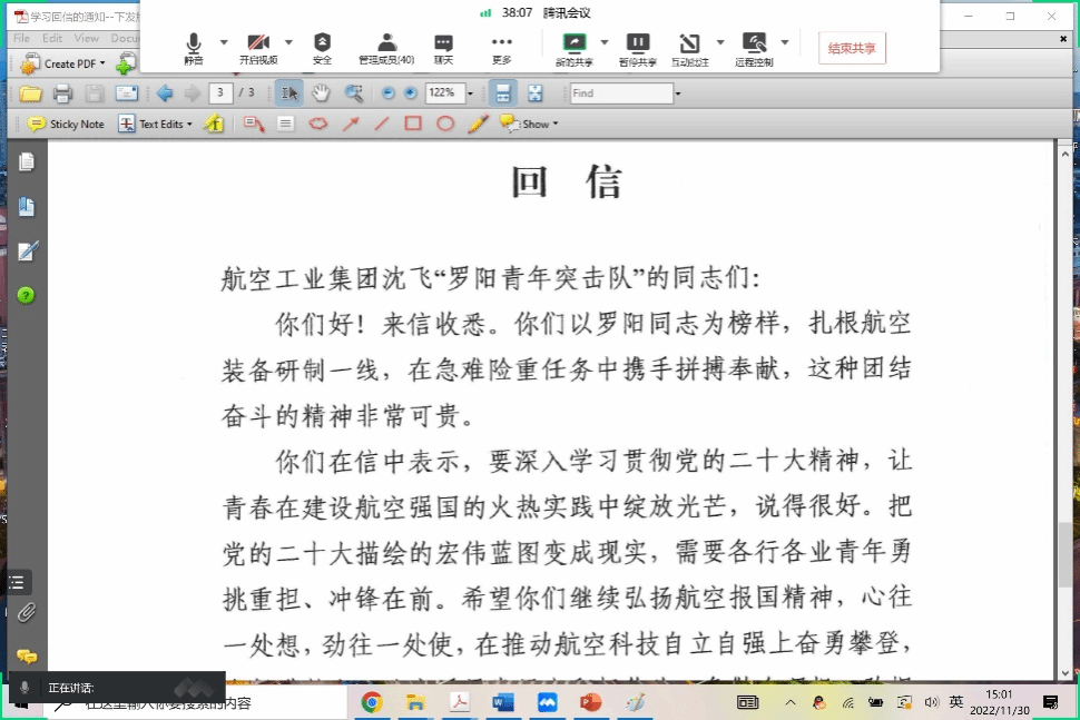 随后,结合央视新闻报道,支部全体党员认真学习了2022年11月12日习近平总书记给中国航空工业集团沈飞“罗阳青年突击队”的队员们回信。回信中,总书记勉励他们学习贯彻好党的二十大精神,为建设航空强国积极贡献力量。让他们以罗阳同志为榜样,扎根航空装备研制一线,在急难险重任务中携手拼搏奉献。同时还提到,把党的二十大描绘的宏伟蓝图变成现实,需要各行各业青年勇挑重担、冲锋在前。争做有理想、敢担当、能吃苦、肯奋斗的新时代好青年,为全面推进中华民族伟大复兴做出新贡献。