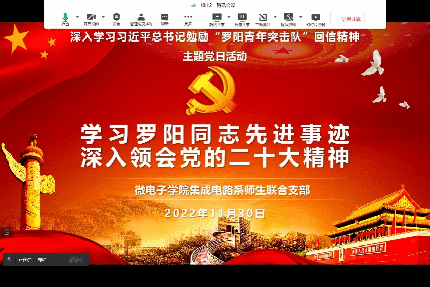 集成电路系师生联合支部全体党员通过腾讯会议平台,围绕习近平总书记给“罗阳青年突击队”的回信,开展了以“学习罗阳同志先进事迹,深入领会党的二十大精神”为题的主题党日活动。本次活动由支部书记刘炜同志主持。