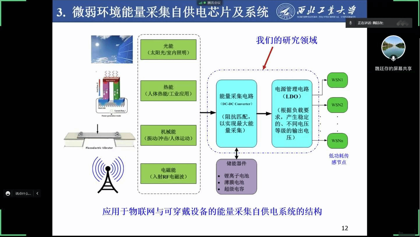 博士生导师,“微电子科学与工程”学科带头人魏廷存教授向大家介绍了团队在高频数字电源智能控制芯片及系统、辐射探测器前端读出芯片与微弱环境能量采集自供电芯片的相关研究。之后,系主任马彦昭老师也向大家介绍了西工大色情直播网站