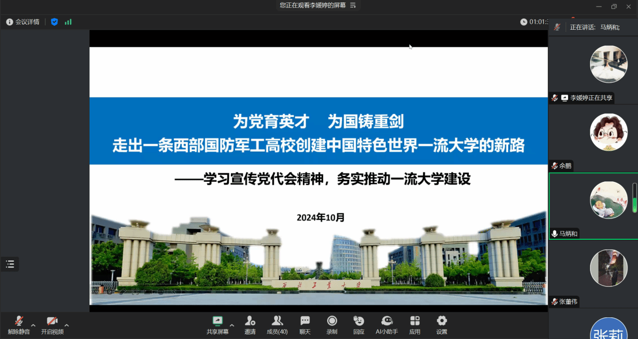 会上,马炳和对学校第十四次党代会召开的背景、时间、重大意义进行了全面介绍。他强调,学校第十四次党代会报告《为党育英才 为国铸重剑 奋力谱写中国特色世界一流大学建设新篇章》是全体共产党员和广大师生员工智慧的结晶,认真做好学校第十四次党代会精神的宣贯工作,是进一步学深悟透党的二十届三中全会和全国教育大会精神,推动党中央重大决策部署落实落地的重要举措。随后,他围绕党的二十届三中全会、全国教育大会对高校提出的新要求新任务,聚焦学校第十四次党代会确定的“天下工大、世界三航”远景目标、新“三步走”战略构想进行了重点解读。