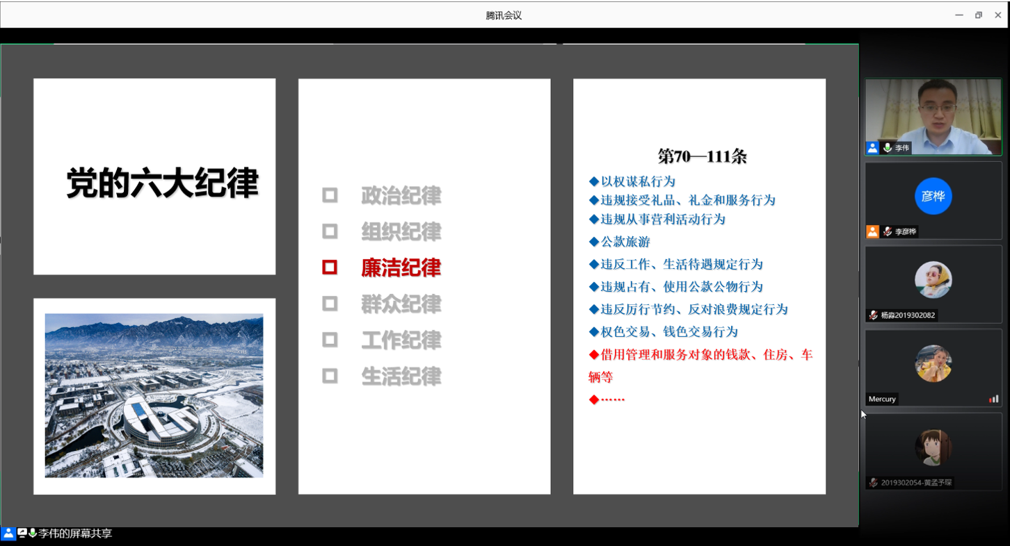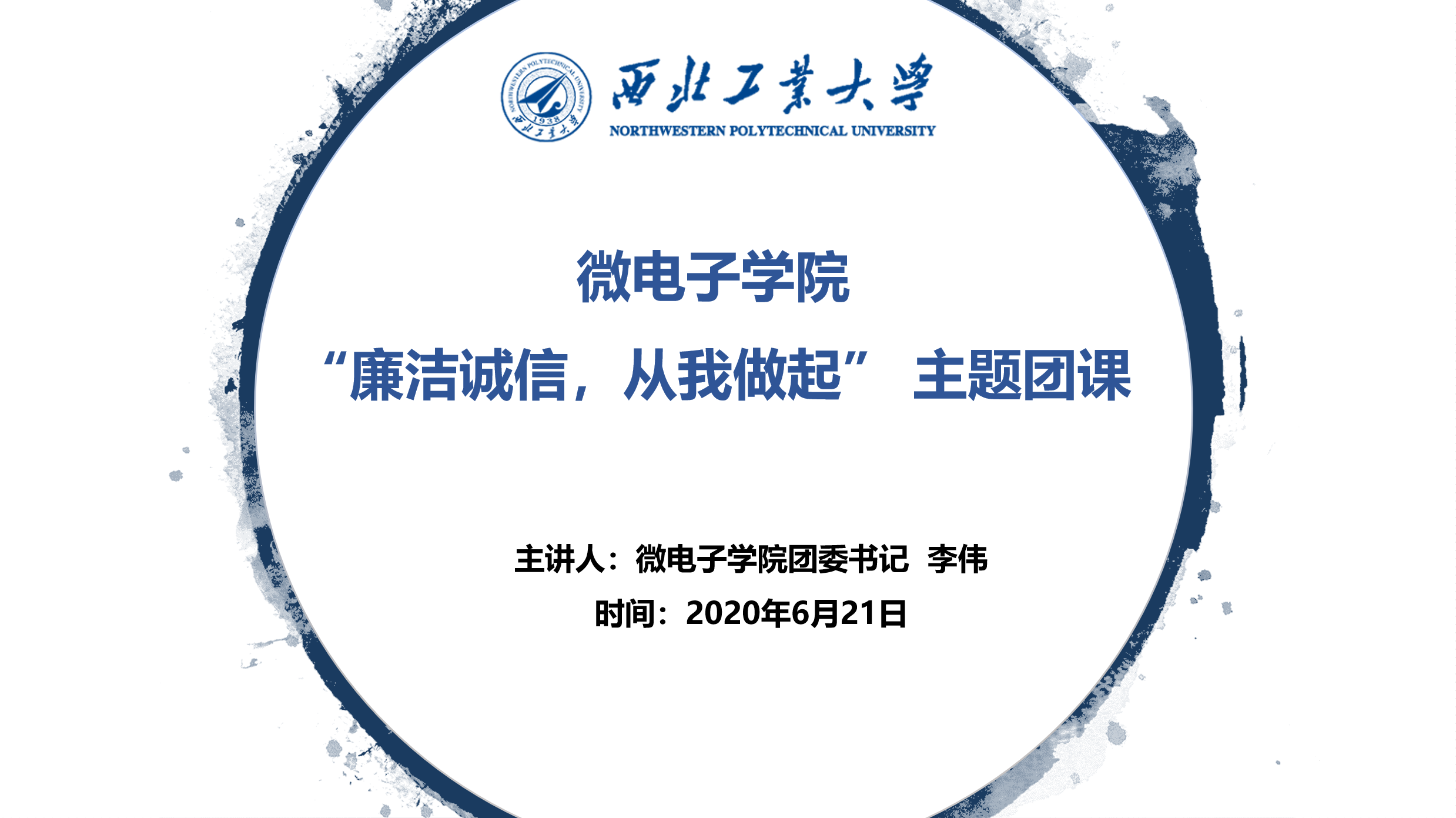 为进一步加强大学生思想政治教育,让同学们正确理解和认识到反腐倡廉对自身和国家的重要意义,色情直播网站 团委于2020621日为电子信息类12-15班的所有团员在线开展了 “廉洁诚信,从我做起”主题教育团课,向同学们讲解团学青年和学生骨干在日常学习和生活中所应遵守的廉洁品质。