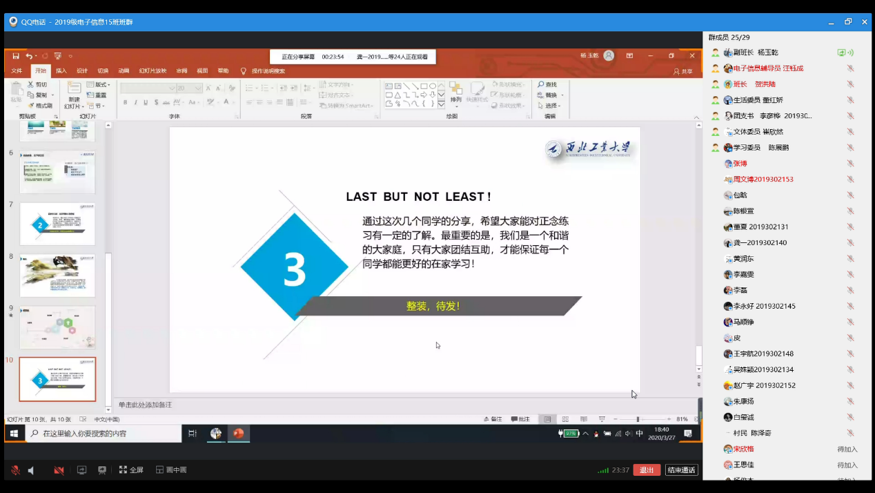 最后,团支书李彦桦同学对班委和同学们的发言进行了总结,并以自身为例提出了一些切实可行的建议。辅导员兼班主任汪钰成老师亦提出在此特殊时期,同学们也应多关心身边人,珍惜相处的时光。