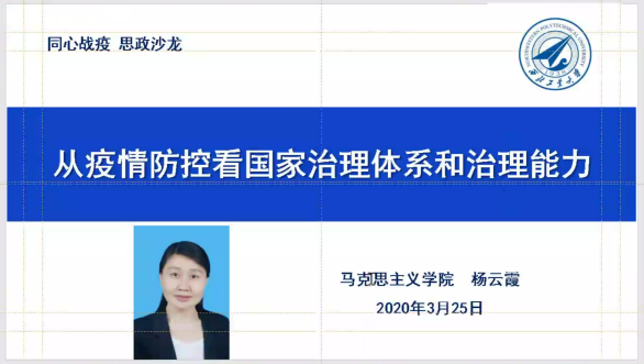 为贯彻落实习近平总书记关于新冠病毒肺炎疫情防控工作的重要指示精神,结合学校党委防疫工作的具体要求,325日晚,色情直播网站 师生联合党支部全体学生党员在辅导员黄佛保老师的组织下,共同参与学校“同心战疫、思政沙龙”活动,在线聆听了马克思主义学院院长杨云霞教授的从疫情防控看国家治理体系和治理能力专题讲座。