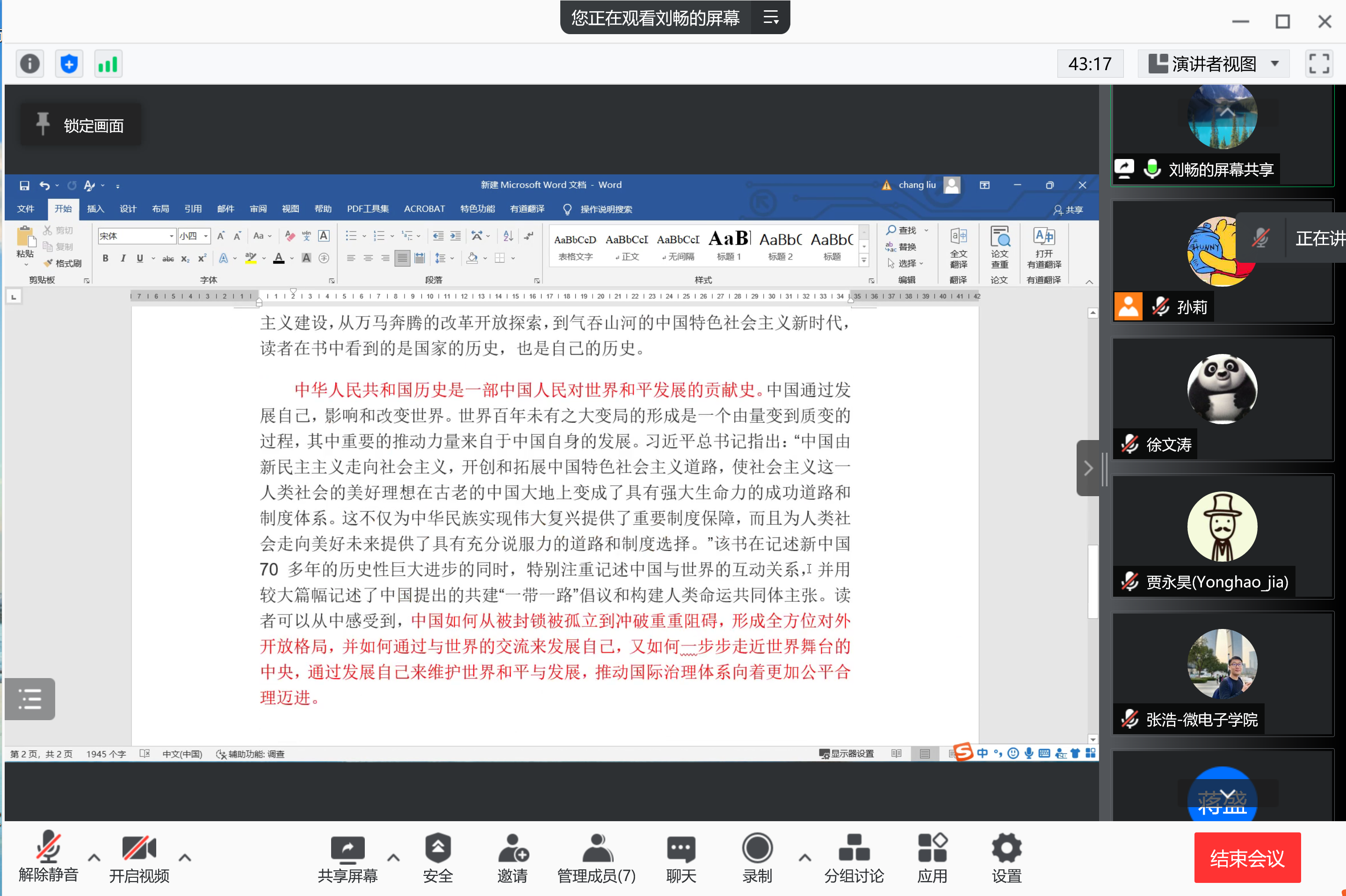 支部主题党日活动,由支部党员刘畅围绕庆祝中华人民共和国成立72周年、纪念辛亥革命110周年等主题,结合学习《中华人民共和国简史》和《新征程面对面》的心得体会,做了深入的分享。通过学习《中华人民共和国简史》,系统地回顾了中国共产党团结带领全国各族人民在经济、政治、文化、社会、生态文明建设以来国防和军队、外交、党的建设等各个方面取得的伟大成就和宝贵经验。每一位党员教师认真做好本职工作,教书育人,持续科研创新,都是为祖国的发展贡献自己的一份力量。在分享学习《新征程面对面》的心得体会时,刘畅老师同时收集相关视频资源,带领大家共同观看相关时政国漫《新征程,舞起来!》,丰富了分享的多样性。