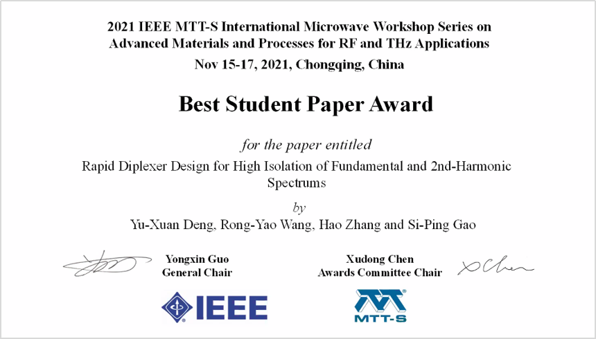 张浩副教授所指导的邓雨轩同学论文“Rapid Diplexer Design for High Isolation of Fundamental and 2nd-Harmonic Spectrums”脱颖而出,获IEEE MTT-S IMWS-AMP 2021最佳学生论文奖。