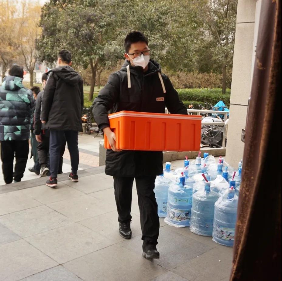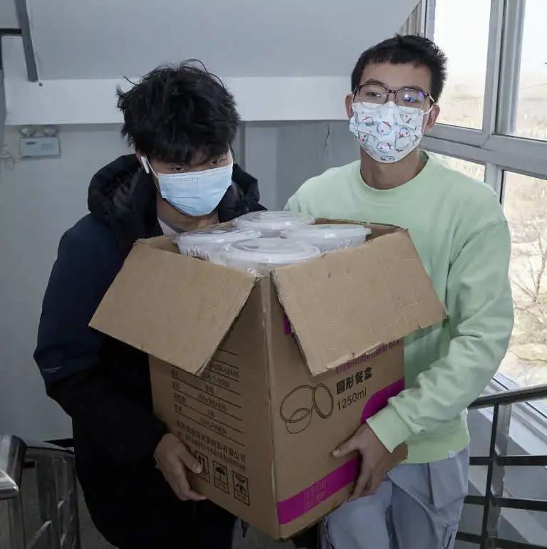 的同学们火速组织,形成了“全员参与,高效互助”的志愿服务格局。每顿饭由一个寝室负责搬运和分发。志愿者们总是早早赶到寝室楼下,冒着严寒把饭菜抬到寝室楼内,并协助清点。然后将沉重的饭箱抬到楼上,对照订餐表,将热腾腾的饭送到同学手中。送餐时,志愿者们还提醒大家注意防疫,及时完成每日疫情填报。除此之外,大家还就有关问题向同学们耐心解答,打通疫情防控的最后距离,形成了“人人为我,我为人人”的良性循环。
