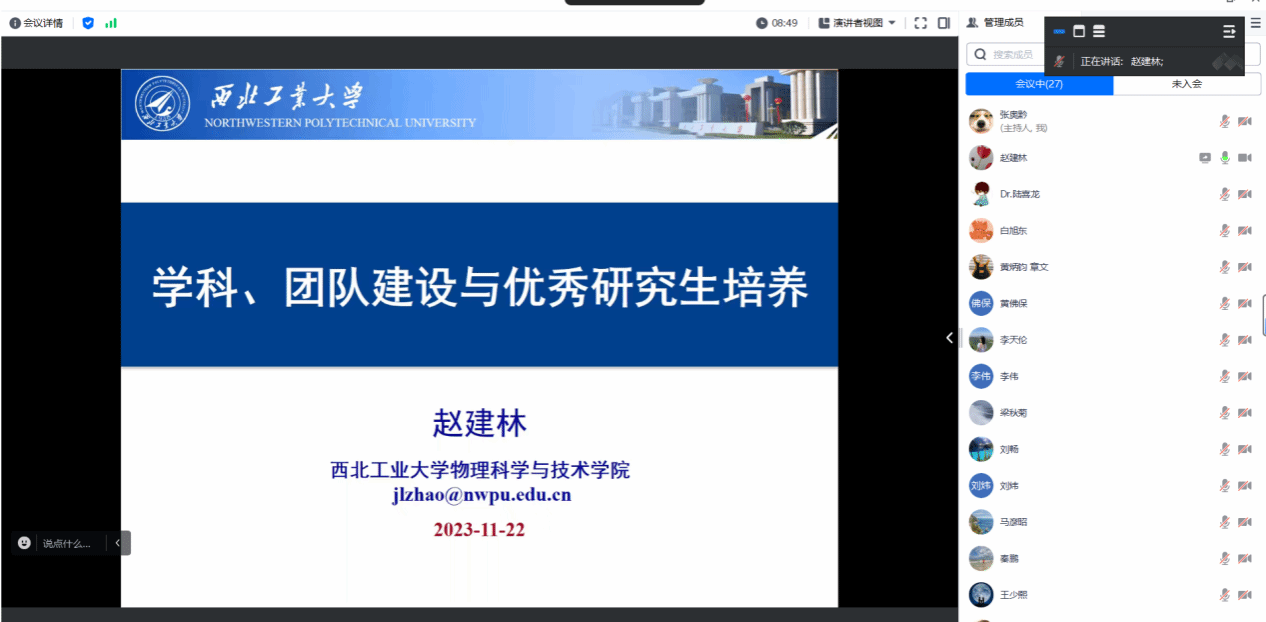 赵建林的报告题目是《学科、团队建设与优秀研究生培养》,围绕研究生教育的特点及目的意义、导师的作用与素质要求、导师与学科的关系、导师与学生的关系、研究生培养过程的几个关键环节、培养和提高学生能力的几个方面展开,强调导师的岗位意识,要尊重学生人格、关注学生心理健康、言传身教、助力学生成长成才,构建良好的导学关系,牢记为党育人、为国育才,扎实完成立德树人根本任务。