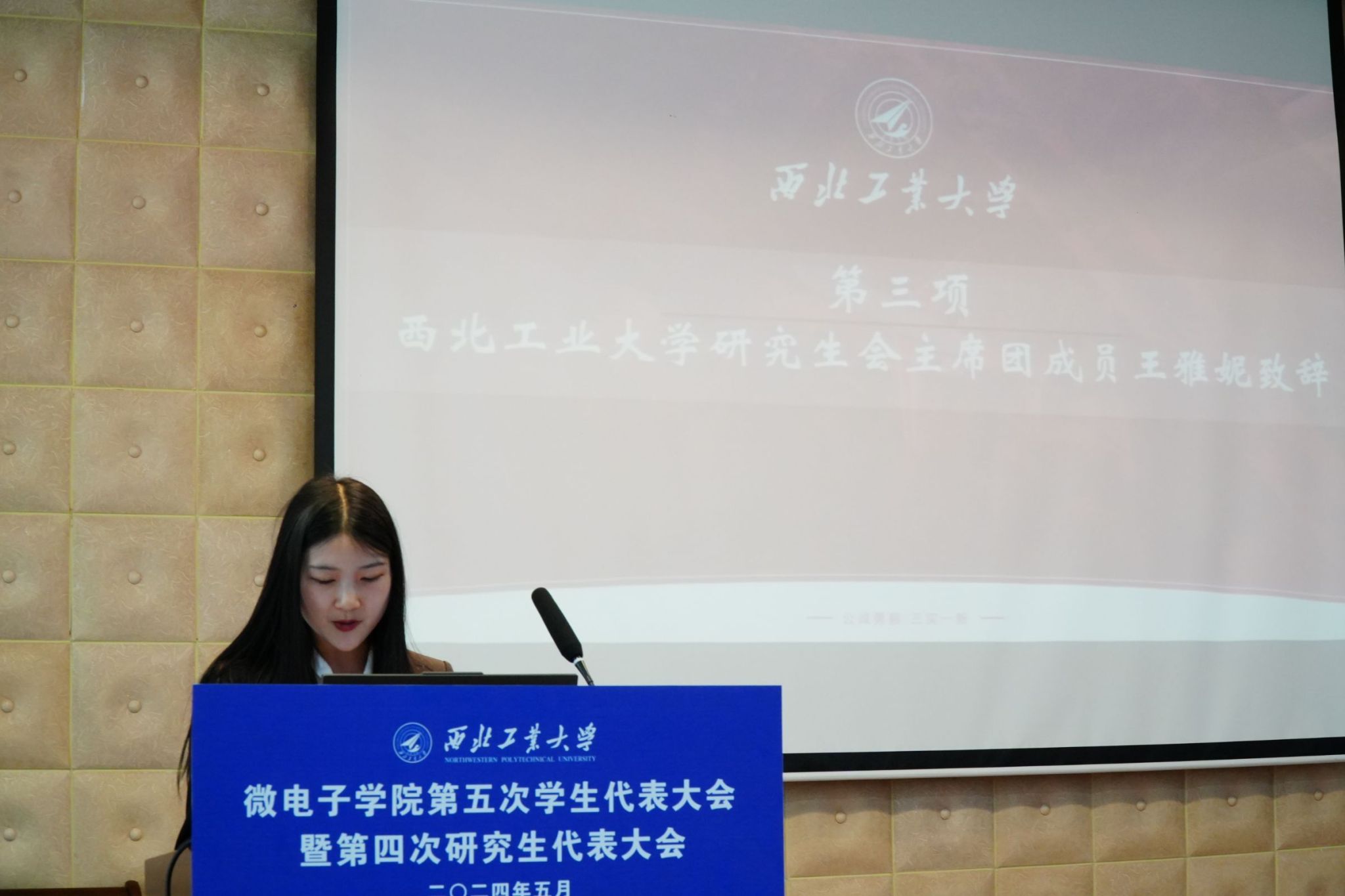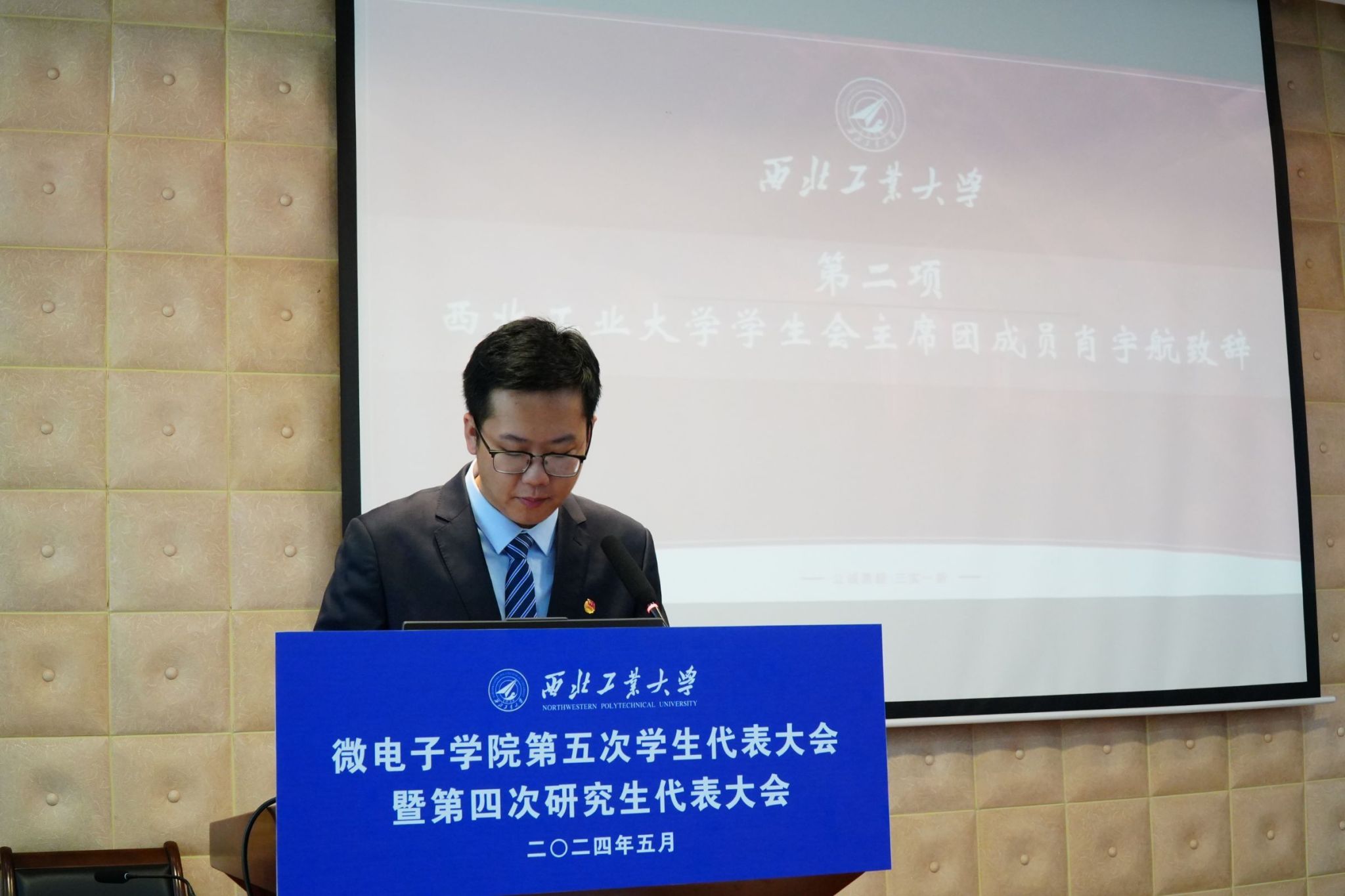 第五次学生代表大会暨第四次研究生代表大会正式拉开序幕。校学生会主席团成员肖宇航致辞,肖宇航分享了自己在校学生会的工作经验,希望同学们能够筑牢青春根基、书写人生华章,强调学生会应全心全意服务同学,并衷心祝愿本次会议顺利召开。随后,校研究生会主席团成员王雅妮发言。王雅妮提到三个“聚焦”——聚焦政治引领、聚焦形神兼备、聚焦主责主业,呼吁同学们团结在党的周围,发扬总师育人文化。
