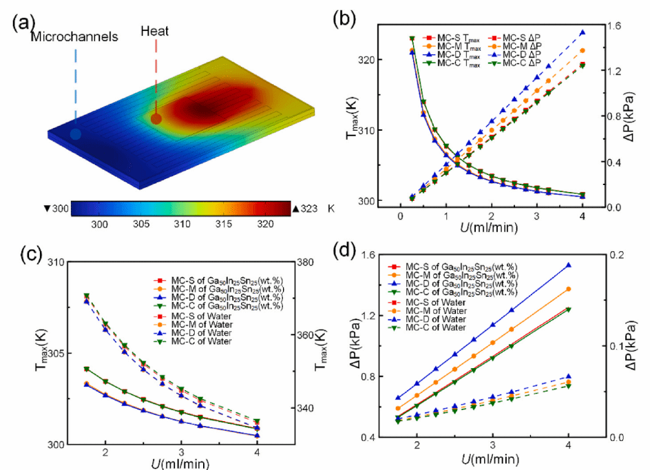 高热流密度是制约微型化高功率微电子系统性能与可靠性的关键因素。团队提出了一种基于液态金属(LM)的微流体冷却系统,通过数据驱动的计算框架优化改进的遗传算法(LC-GA),旨在为高密度集成系统提供高效的热管理解决方案。通过在硅基板上集成LM近端冷却与微通道散热技术,团队开发出一种异构三维互连冷却架构,能够通过算法引导的参数调优实现热性能优化。为验证该方法,我们设计、制备并实验测试了四种不同微通道结构。将LM引入通道后,对模拟热源进行了实验冷却测试和热性能仿真。实验结果表明,通过计算参数确定优化的LM微流体冷却系统,可有效散热功率高达800W的芯片,同时保持稳定热性能。此外,结合响应曲面法与改进的LC-GA进行多因素敏感性分析和多目标优化,实现了热阻与压降平衡的最优设计参数和运行参数的自动确定。优化后的配置将芯片最高温度降至约357.54K,降低了系统压力要求,并将性能评估标准(PEC)提升至2.327。本研究提出了一种数据驱动的优化方案,通过算法辅助的热设计支持高性能集成微系统开发。成果以“Liquid metal microfluidic cooling system for high-efficiency thermal management via learning-based genetic algorithm”发表于《ENGINEERING APPLICATIONS OF ARTIFICIAL INTELLIGENCE》。(1区TOP)